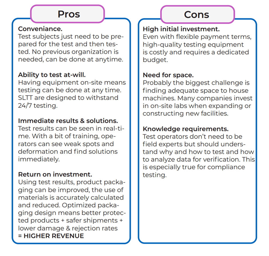 Uma opção mais conveniente, e com uma boa relação custo-benefício a médio e longo prazo, é ter um laboratório local dedicado nas instalações da sua organização. Para além de poderem ser realizados os mesmos tipos de ensaios que um serviço contratado (conformidade, durabilidade, certificação), os testes no local podem ajudam a otimizar todos os três tipos de embalagem: primária, secundária e terciária. Os engenheiros e designers de embalagens têm a capacidade de testar uma e outra vez sem limitações. Empresas que investiram em máquinas de ensaio reportam menor produção custos, o que significa menos custos de rejeição ou danos e clientes mais satisfeitos. Embora o investimento inicial possa ser grande, as poupanças de custos a longo prazo tornam esta uma opção desejável especialmente se tiver um espaço alocado a ensaios.