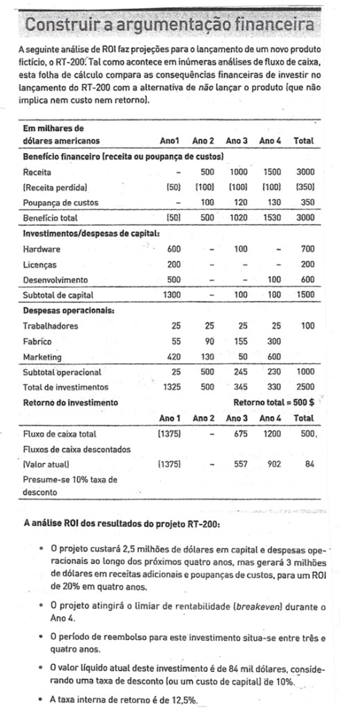 Imaginemos que quer gastar de 200 mil de dólares num novo sistema automatizado de atendimento de chamadas. Está concentrado em reduzir tempos de espera de 60 para 30 segundos, esperando com isso fazer disparar a satisfação e a fidelidade dos clientes. Por mais importantes que estas melhorias sejam, não são aquilo que mais entusiasma os os tipos da massa do departamento financeiro. Para eles, o benefício principal reside em acrescentar mais dinheiro à linha dos resultados. Visto serem eles os únicos a decidir sobre o seu projeto, não só tem de lhes fazer compreender de que forma o novo sistema aumentará os lucros, como também conseguir utilizar a linguagem dos modelos financeiros para argumentar em favor da sua iniciativa.