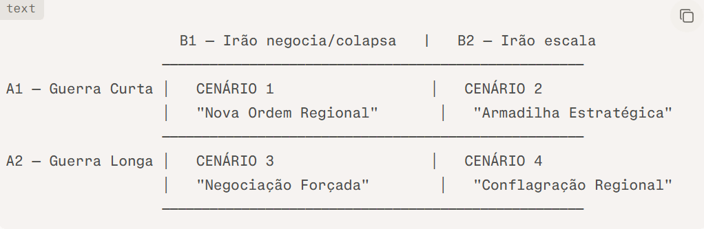 Cenário 1 — “Nova Ordem Regional” (guerra curta + Irão negocia): baixa-média probabilidade